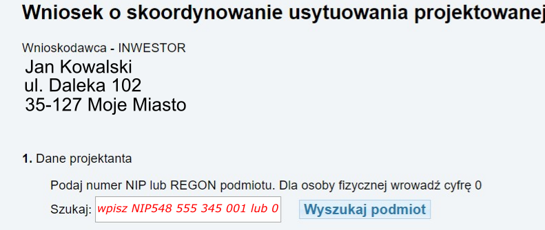 Jeżeli wnioskodawcą jest projektant w polu WYSZUKAJ PODMIOT podaje on dane INWESTORA.